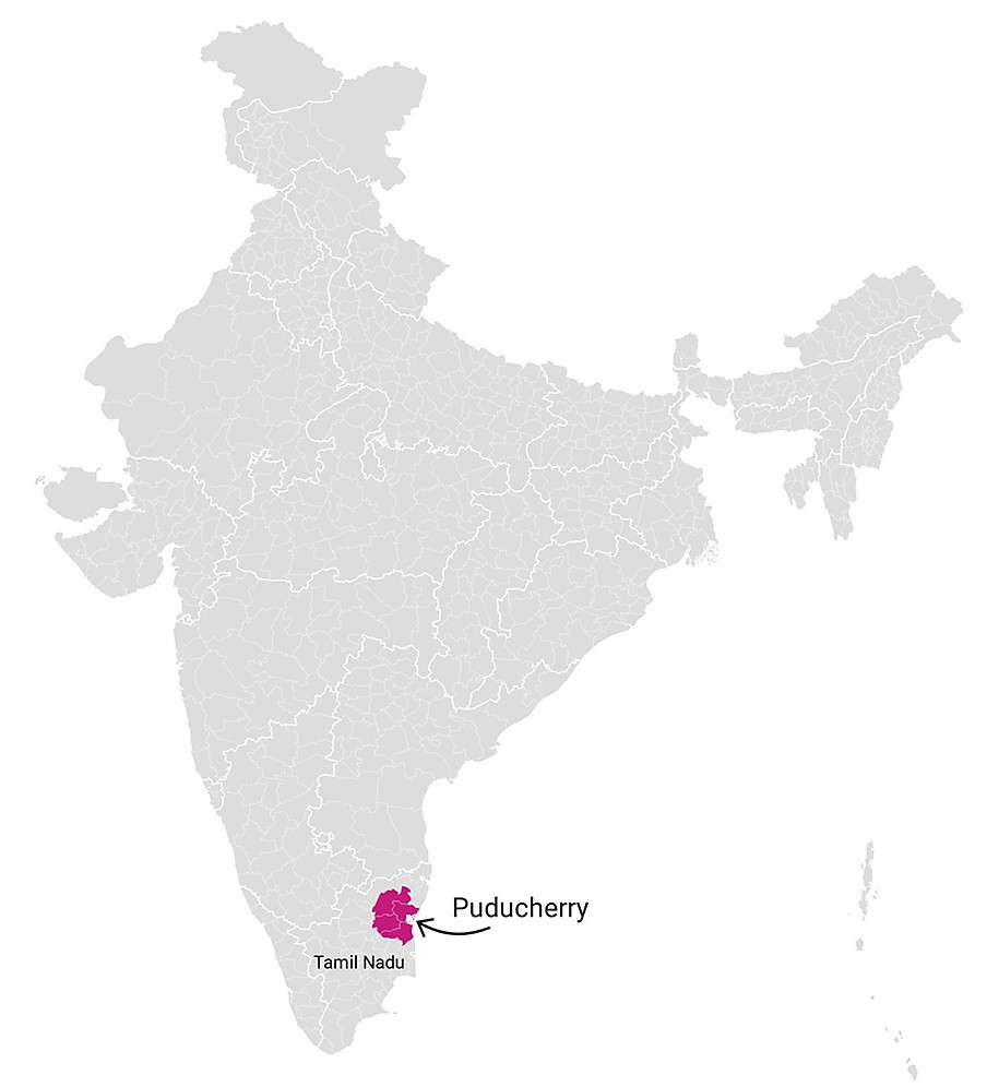 Puducherry is a geographically non-contiguous Union Territory comprising four enclaves in three different states: the Puducherry district (surrounded by Tamil Nadu), Karaikal district (also within Tamil Nadu), Mahé district (within Kerala), and Yanam district (within Andhra Pradesh). All four enclaves vote in the same assembly election, making Puducherry's electoral geography genuinely unique in India.
